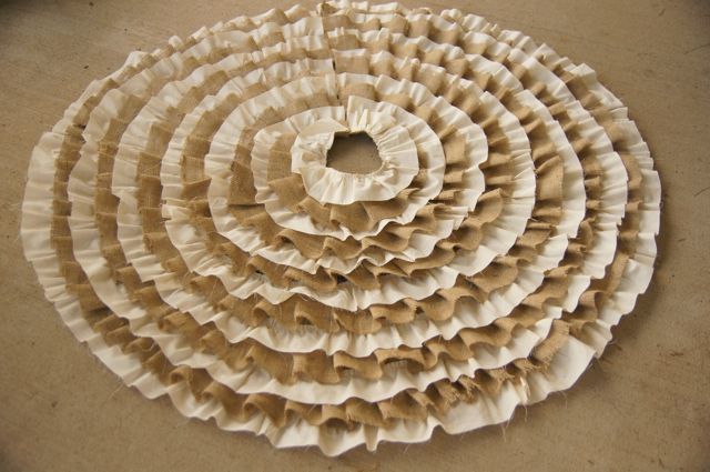 So I got to work cutting my fabric into 3" wide strips and I used the ruffler foot for all the muslin.The burlap will not ruffle, so I had to pin each pleat prior to sewing it. I made a base from burlap and then started attaching my ruffles! I started on the outside and worked my way in.